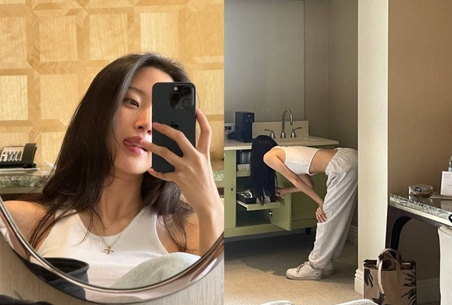 사진 속 문가영은 크롭 기장의 민소매 티셔츠에 트레이닝복을 입고 있는 모습. 문가영은 긴 생머리를 늘어뜨리고 거울 앞에서 자신의 모습을 촬영하고 있는가 하면, 부엌에서 허리를 숙여 무언가를 찾고 있다.