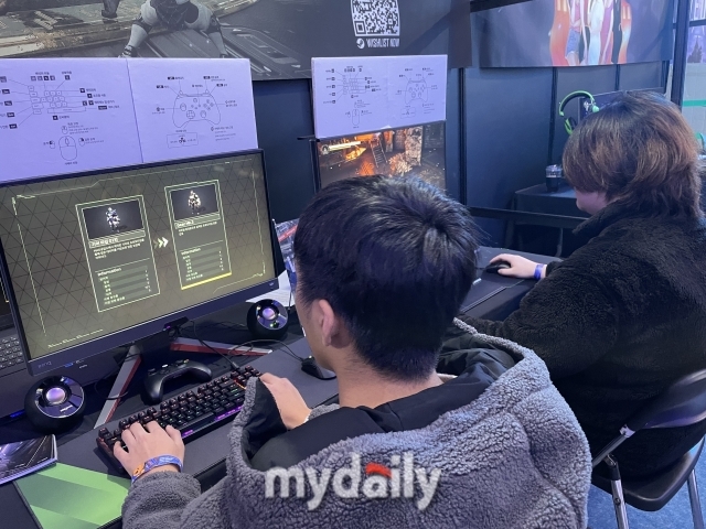 <베다>는 게임 중에서도 어려운 난이도를 자랑하는 ‘소울라이크’류 게임을 이용자에게 훈련할 수 있게 한다. 부스를 찾은 관람객은 <베다>를 시연하면서 소울라이크 장르 게임의 전투, 액션 등을 배워나갔다.