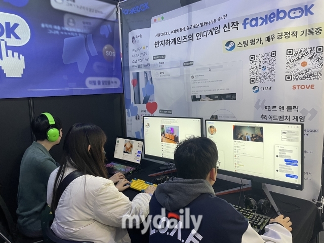 <페이크북>은 친구와 가족 등 주변 인물 비밀을 찾아내며 팔로워를 모아가야 하는 추리 어드벤처 게임이다. 부스 방문객은 언니 죽음에 대한 진실을 밝히는 어드벤처 게임을 시연해 볼 수 있다.