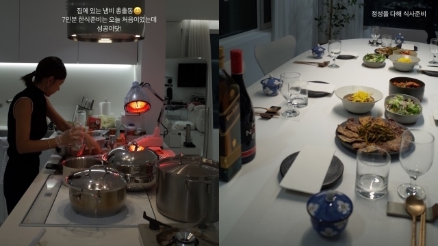 이후 김준희는 다음날인 지난 29일 "집에 있는 냄비 총출동. 7인분 한식 준비는 처음이었는데 성공이닷!", "정성을 다해 식사준비", "사랑하는 우리 시댁 식구들과♥"라는 글과 함께 정성껏 차려낸 푸짐한 한상과 시댁 식구들과의 행복한 식사 모습을 추가했다.