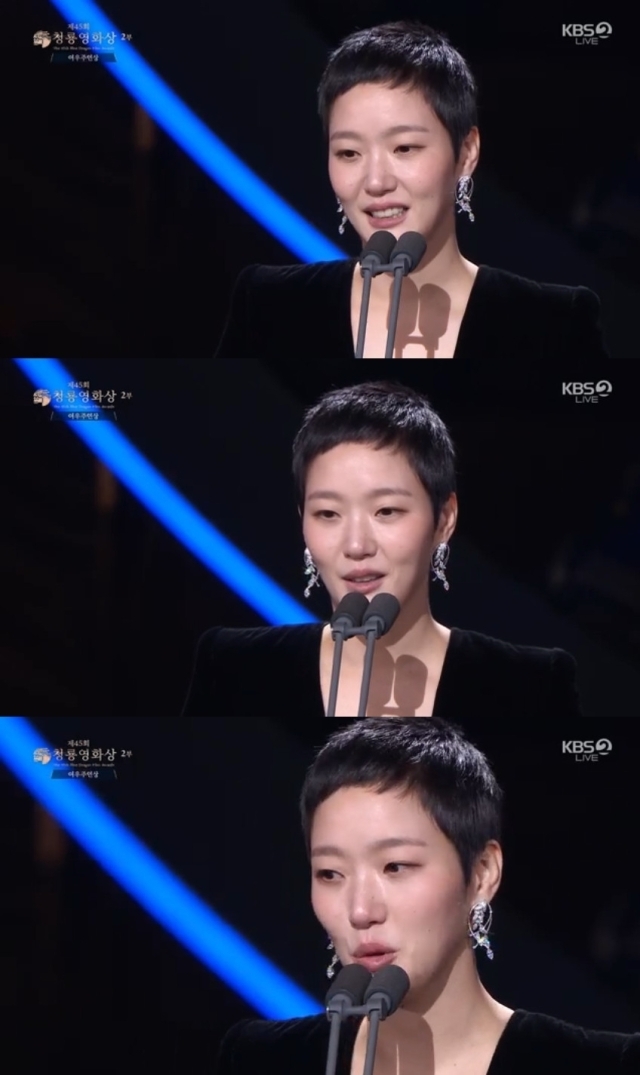 그러면서 청룡영화상에 오니까 내가 신인상을 받았을 때가 생각이 난다. 정지우 감독님께도 참 감사하다는 이야기하고 싶다. 나라는 배우를 소개해주시고 애정과 염려의 시선을 가고 있는 길을 바라봐 주셔서 내가 더 잘 성장해 나갈 수 있던 것 같다"라고 회상했다.