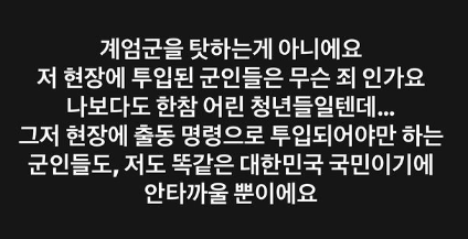 이어 "계엄군을 탓하는게 아니고, 저 현장에 투입된 군인들은 무슨 죄인가? 나보다도 한참 어린 청년들인텐데"라며 "그저 현장에 출동 명령으로 투입되어야만 하는 군인들도, 저도 똑같은 대한민국 국민일 뿐이다"라며 안타까운 심경을 전했다.
