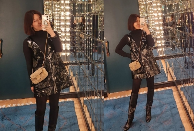 한혜연은 검정색 롱부츠를 착용하고 베이지색 크로스백으로 포인트를 주며 경쾌한 패션 센스를 드러냈다.