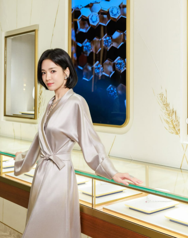 사진 속 송혜교는 자신이 앰버서더로 활약하고 있는 한 주얼리 브랜드의 행사장에 참석한 모습. 송혜교는 브이넥 실크 드레스를 걸치고 단발을 한 채 고급스러운 미모를 드러냈다.