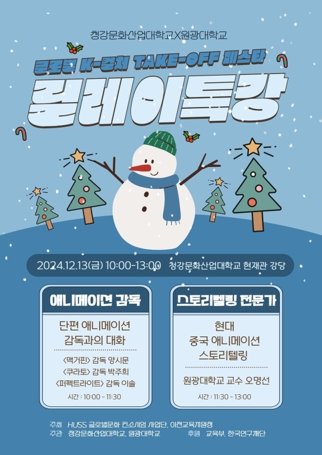 [마이데일리 = 천주영 기자] 청강문화산업대학교와 인문사회융합인재양성사업(이하, HUSS) 글로벌문화 컨소시엄 사업단이 릴레이특강 프로그램 ‘테이크오프 페스타(Take-Off Festa)’를 진행한다고 11일 밝혔다.