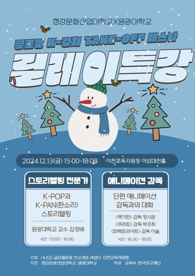 2부는 이천교육지원청 이섭대천홀에서 원광대학교 김정배 교수의 ‘K-POP과 K-PAN(판소리) 스토리텔링’, 청강대 학생감독 3명의 ‘단편 애니메이션 감상 및 감독과의 대화’로 구성된다.