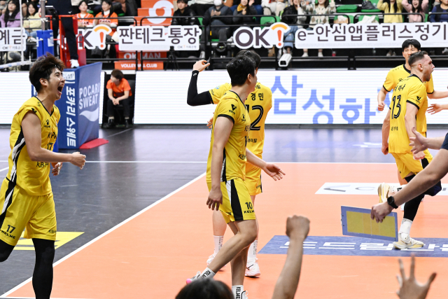 [마이데일리 = 안산 곽경훈 기자] KB손해보험이 풀세트 접전 끝에 OK저축은행을 세트 스코어 3-2(25-18 23-25 19-25 25-21 15-10)으로 꺾었다.