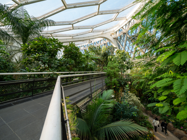 온실 최대 높이 25m를 향해 쭉쭉 뻗어가는 야자수와 따사로운 볕에 반짝이는 올리브나무, 2000년 넘도록 굳건한 바오바브나무를 비롯해 식물 1000여 종이 자란다. 약 8m 높이 스카이워크에서는 키 큰 열대 식물과 같은 눈높이에서 인사할 수 있다.