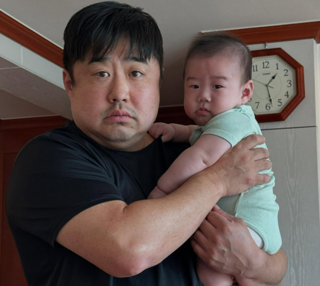 사진 속 강재준은 아들을 안고 함께 카메라를 응시하는 모습이다. 둘은 똑같은 얼굴로 놀라움을 안겼다.
