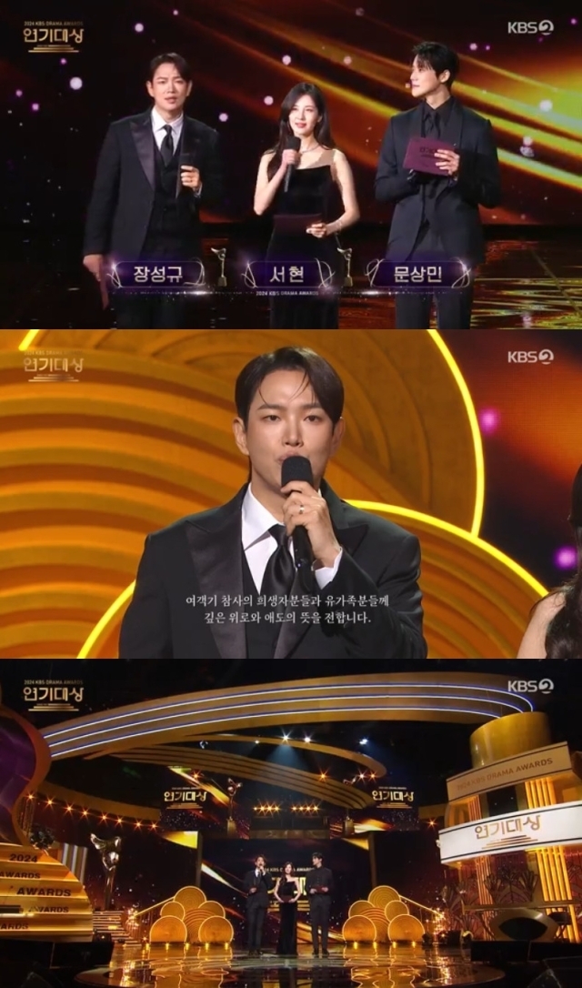 11일 여의도 KBS홀에서 열린 '2024 KBS 연기대상'이 방송됐다. 당초 지난해 생방송으로 진행될 예정이었으나 제주항공 여객기 참사로 인해 녹화방송으로 변경됐다. 진행은 방송인 장성규, 그룹 소녀시대 서현, 배우 문상민이 맡았다.
