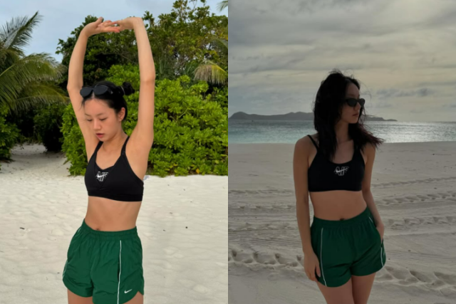 사진 속 혜리는 해변가에서 포즈를 취하고 있다. 검은색 브라톱에 초록색 팬츠를 입고 탄탄한 몸매를 자랑하고 있어 눈길을 끈다.