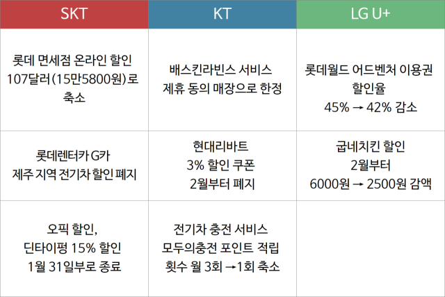 KT는 배스킨라빈스 혜택을 일부 매장으로 제한하고, 현대리바트 3% 할인 쿠폰을 2월부터 폐지한다. 전기차 충전 서비스 모두의충전 포인트 적립 횟수도 월 3회에서 1회로 축소됐다.