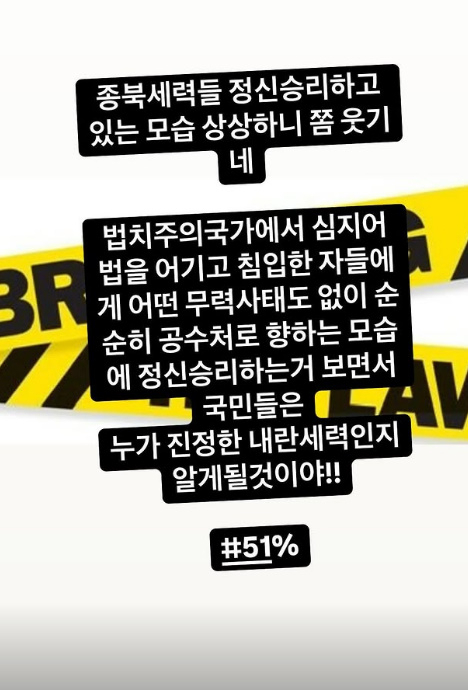 JK김동욱은 15일 개인 계정에 "종북세력들 정신 승리하고 있는 모습 상상하니 좀 웃긴다. 법치주의 국가에서 심지어 법을 어기고 침입한 자들에게 어떤 무력 사태도 없이 순순히 공수처로 향하는 모습에 정신 승리 하는 거 보면서 국민들은 누가 진정한 내란 세력인지 알게 될 것"이라고 했다.
