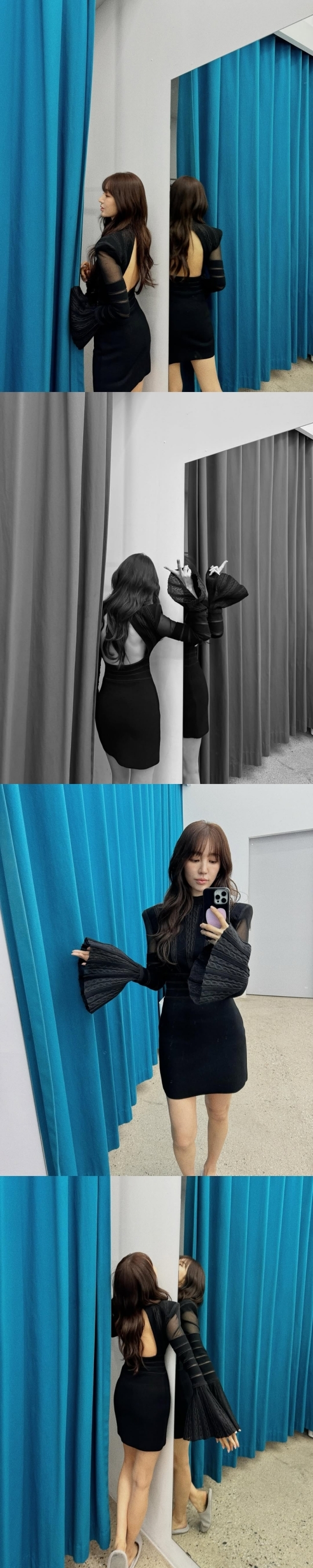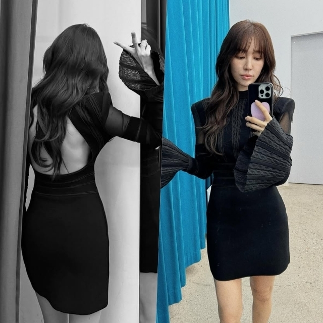 공개된 사진 속 윤은혜는 거울에 비친 자신의 모습을 카메라에 담고 있다. 등 라인이 드러난 검은색 반전 원피스를 완벽 소화한 모습이다.