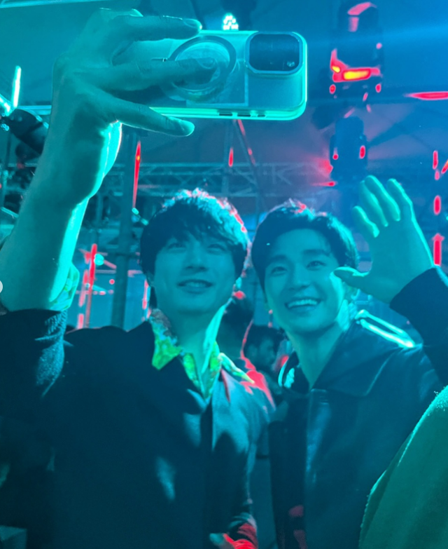 특히 김수현은 사카구치 켄타로와 함께 카메라를 바라보며 셀카를 찍고 있다. 김수현은 카메라를 향해 활짝 웃으며 손을 흔들고 있는 모습. 두 배우는 훈훈한 미모와 스타일리시한 패션으로 독보적인 아우라를 뿜어냈다.