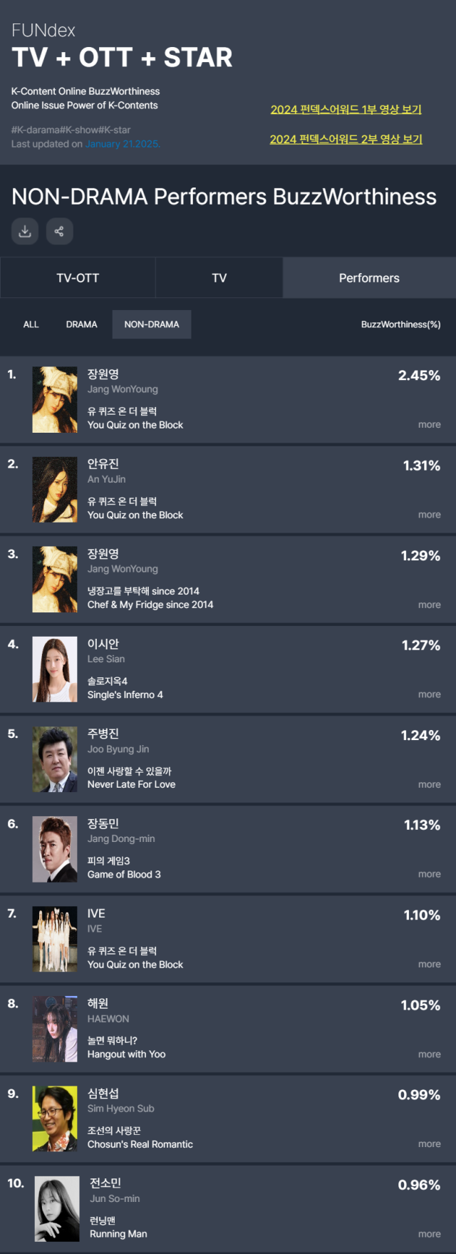 굿데이터코퍼레이션 펀덱스(FUNdex)에서 발표한 1월 3주차 TV-OTT 통합 비드라마 출연자 화제성 부문에서 tvN ‘유 퀴즈 온 더 블럭’에 출연한 장원영이 1위에 올랐다. 다양한 원영적 사고와 마음 다스리는 방법 등에 대해 말한 것이 네티즌 사이에서 화제가 되었다. 장원영과 함께 출연한 아이브(IVE) ‘안녕즈’ 안유진은 출연자 화제성 2위에 올랐다.
