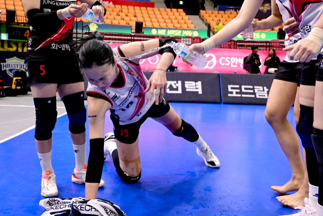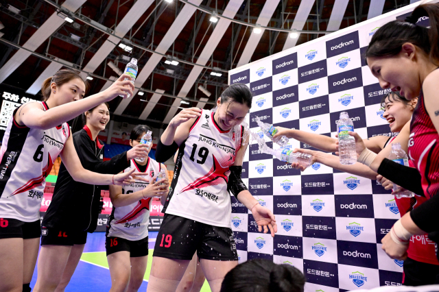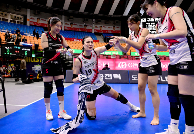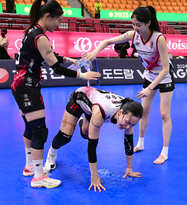 [정관장 표승주가 물세례를 받고 있다 / 한국배구연명(KOVO)]