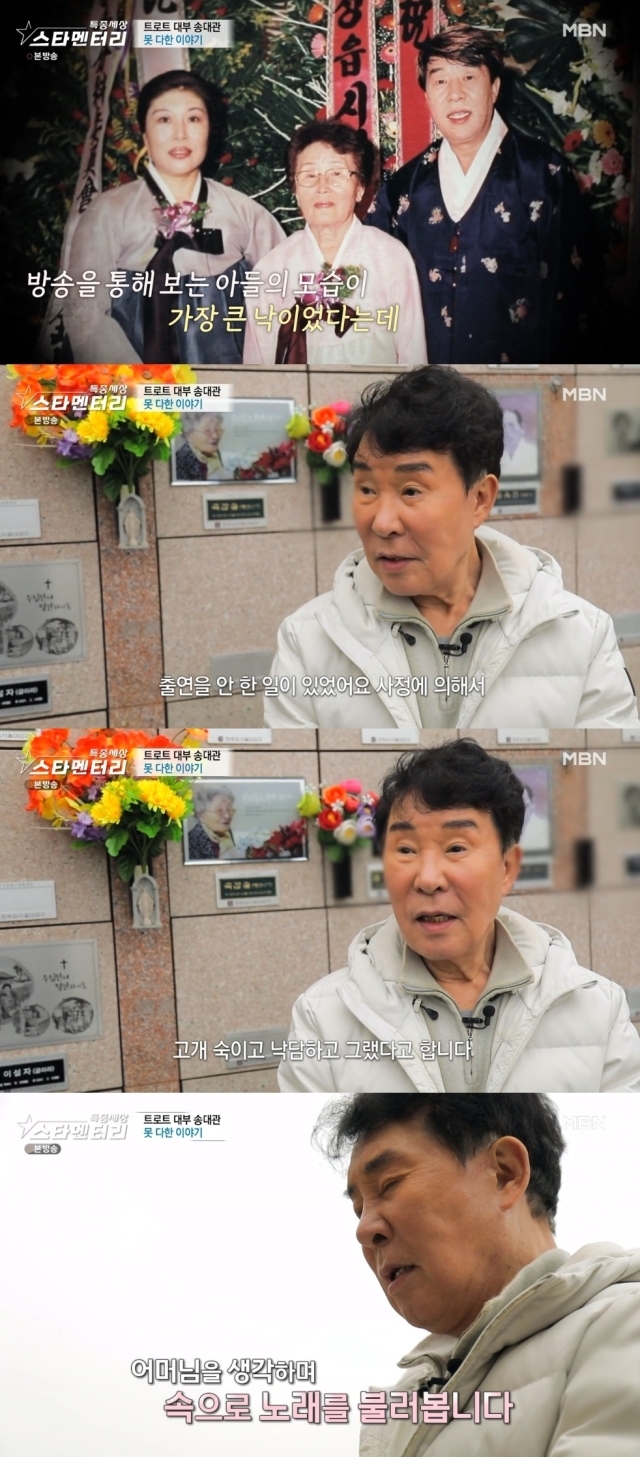 그런 어머니의 앞에 선 송대관은 "어머니, 아들 왔어요. 대관이, 큰 아들"이라 인사하며 차가운 봉안당을 어루만졌다.