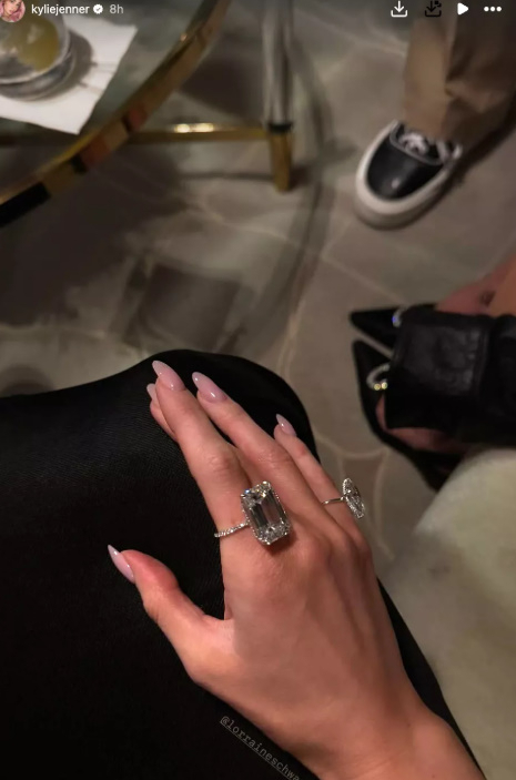인스타그램 스토리에 공유한 손 클로즈업 사진에 따르면, 제너는 새끼손가락에 끼고 있는 약간 덜 크지만 여전히 큰 반지로 장식을 더했다.