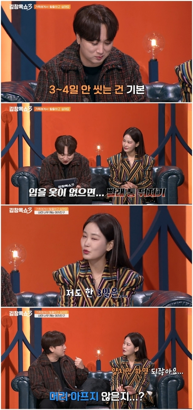 이에 김지민은 “사실 저도 한 3일은 안 씻는다. 집에서 안 나가면 왜 굳이? 양치만 하면 된다. 머리가 긴 사람들만의 그런 게 있다"면서 객석을 향해 "나만 안 씻어?”라고 했다.