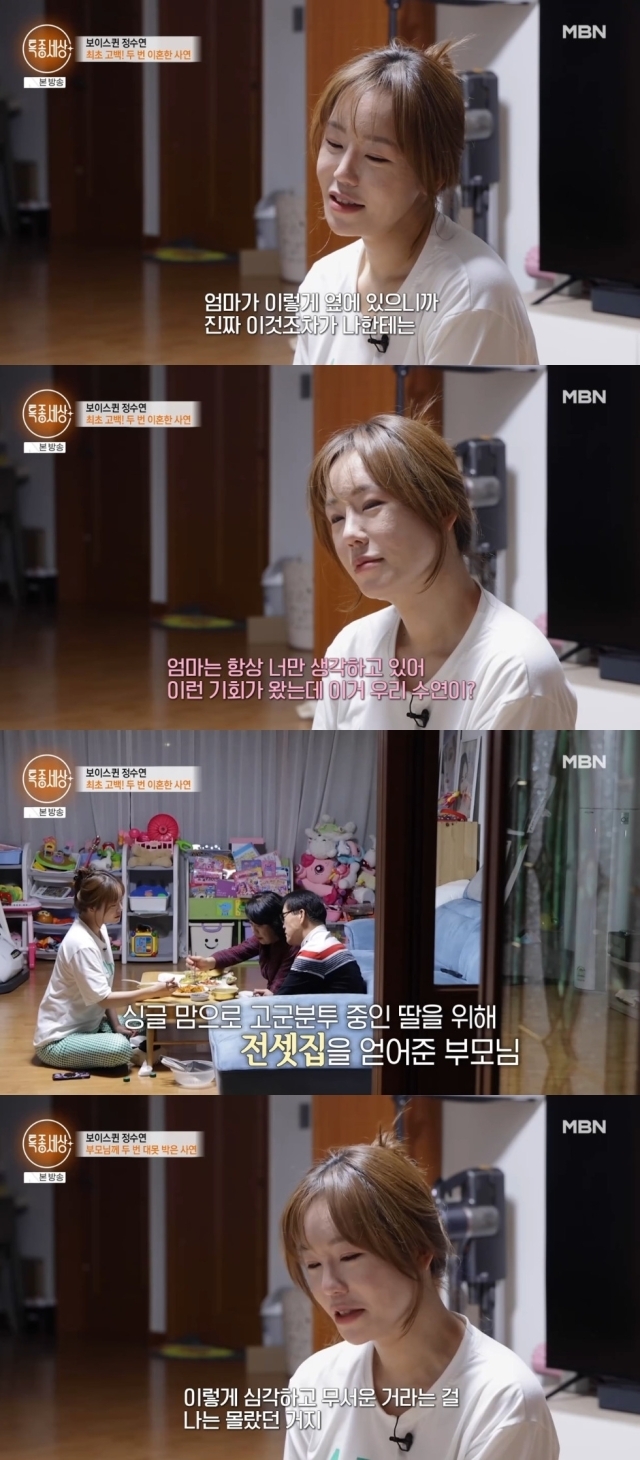 13일 방송된 종합편성채널 MBN '특종세상'에서는 다시 싱글맘으로 돌아온 '보이스퀸' 우승자 정수연이 출연했다.