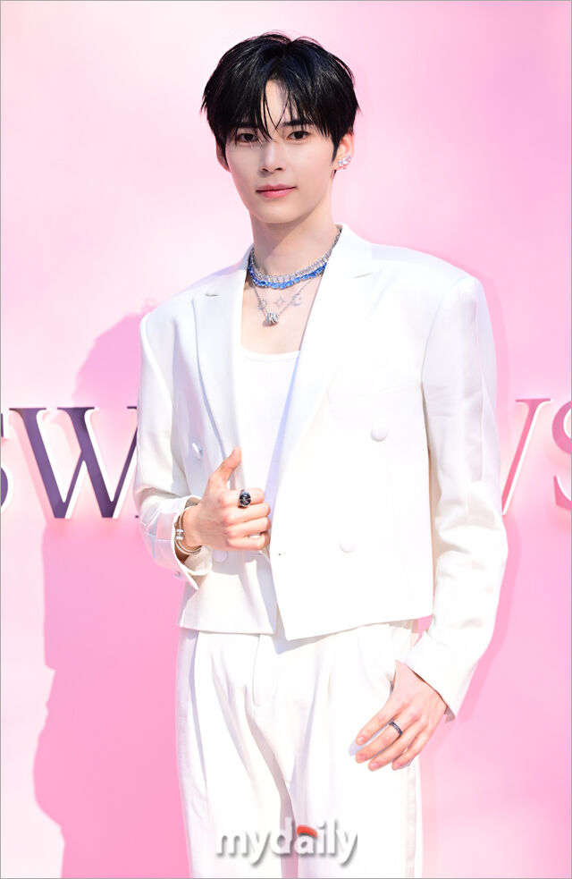 성한빈은 화이트 슈트에 푸른색과 투명한 크리스털 주얼리로 네크라인에 포인트를 준 패션을 선보였다. 빈틈없는 완벽한 비주얼로 현장의 탄성을 자아냈다. 포즈를 마친 성한빈은 팬을 향하 손인사를 하며 팬 서비스를 했다.