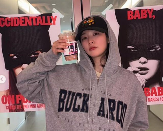 12일 슬기는 자신의 SNS에 "나로 가득한 우리 회사"라는 글과 함께 여러 장의 사진을 올렸다. 사진 속 슬기는 '베이비 낫 베이비' 콘셉트 사진이 담긴 커피잔을 손에 들고 있다. 또 SM엔터테인먼트로 보이는 곳에서 화장기 없는 얼굴에 모자를 눌러쓰고 후드티와 편안한 일자바지를 입고 있다.