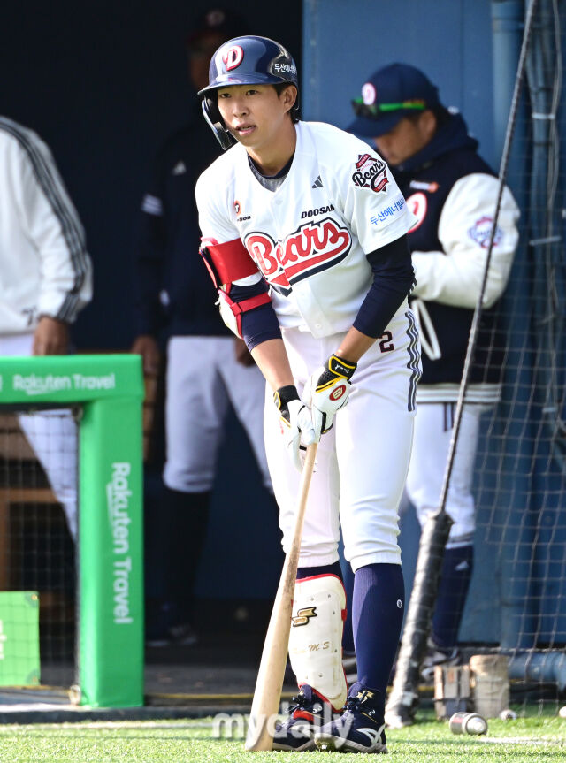 두산 김민석이 9회말 1사 1루서 대타 준비를 하고 있다.