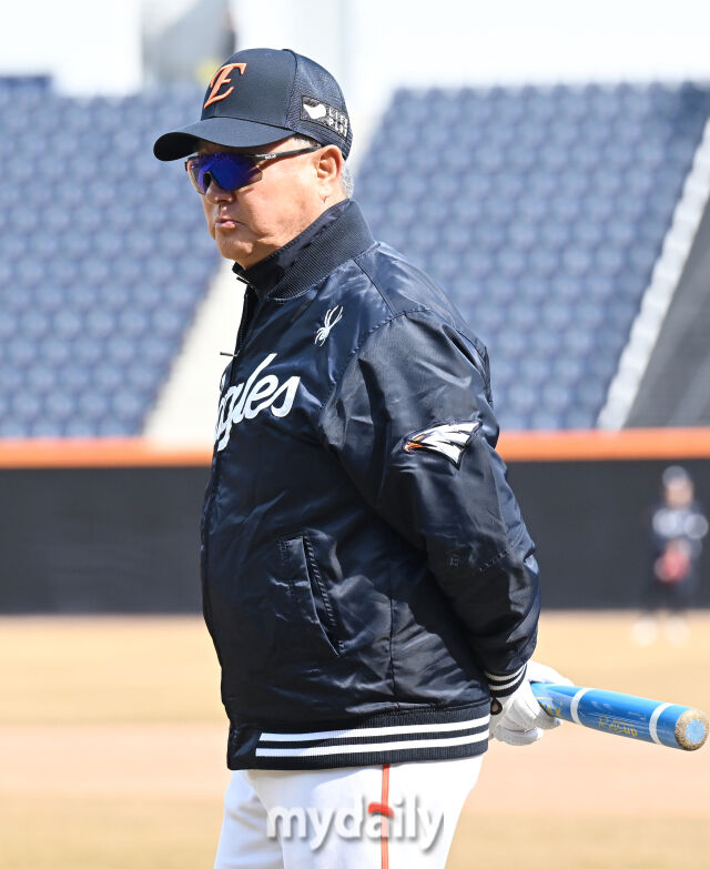 한화 김경문 감독이 경기전 훈련에서 선수들을 지켜보고 있다.