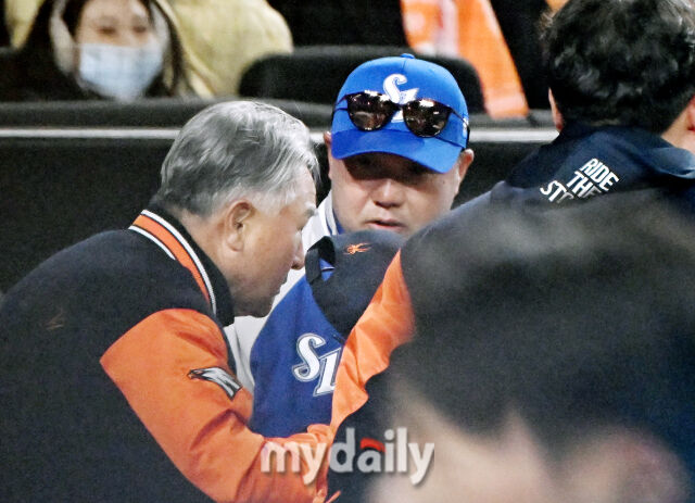 한화 김경문 감독과 삼성 박진만 감독이 5회말 한파 콜드 게임으로 경기가 끝난 뒤 인사를 나누고 있다.
