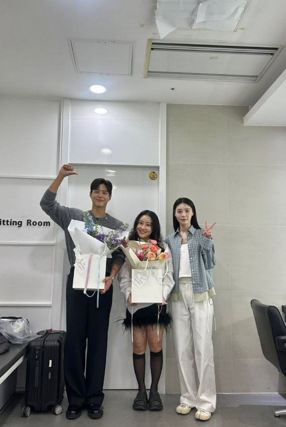 사진 속 조현아는 꽃다발을 들고 카메라를 향해 활짝 웃고 있는 모습. 조현아의 양옆에는 박보검과 주지아가 서있다.