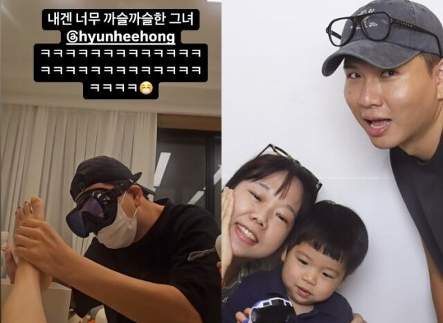 아들 준범이는 제이쓴 옆에서 요리 기구를 가져와 같이 작동시키려고 한다. 제이쓴은 "준범아 이거는 요리 재료가 아냐"라고 말하며 준범이를 제지시킨다. 이어진 영상에서 제이쓴이 뭔가에 열중하는지 정체가 드러난다. 바로 아내 홍현희의 발바닥 각질을 제거하고 있었던 것. 기계 작동음은 전동 각질 제거기 소리였다.