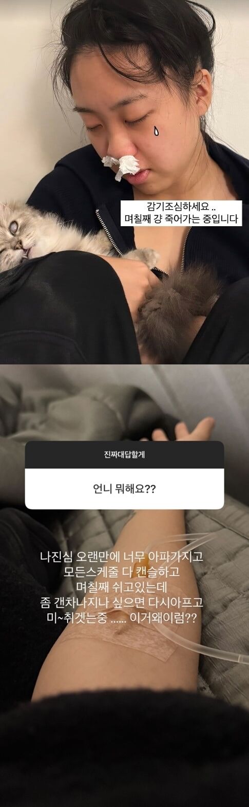 또 다른 팬의 "밥은 먹었어?"라는 질문에는 "나 머리 아파"라고 짧게 답하며 현재 상태가 좋지 않음을 드러냈다. 함께 공개된 사진에는 병원을 찾아 링거를 맞고 있는 이영지의 모습도 담겨 팬들의 안타까움을 자아냈다.
