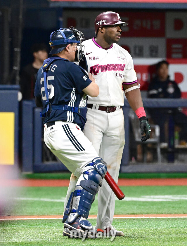 벌써 세 번의 사구와 얼굴로 향하는 세 번의 위협구를 당한 키움이었다. 추가 벤치 클리어링이 일어나도 이상하지 않은 상황이었다. 그래서 그런 것인가 9회 두산 양석환은 바뀐 투수 박주성의 초구에 맞았고 배트를 던지며 1루 베이스를 밟았다.