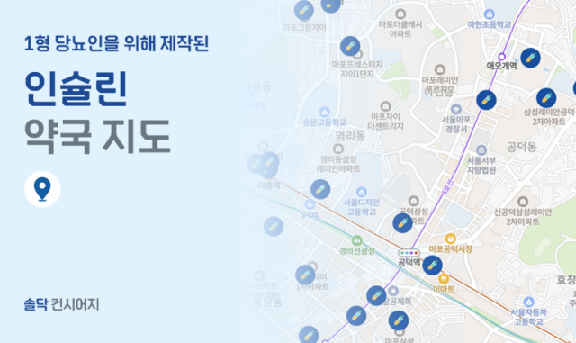 솔닥은 만성질환 환우들을 위한 원격 건강관리 서비스를 제공하는 기업으로 인슐린 약국 지도 서비스는 솔닥 컨시어지 웹페이지에서 누구나 무료로 이용할 수 있다.