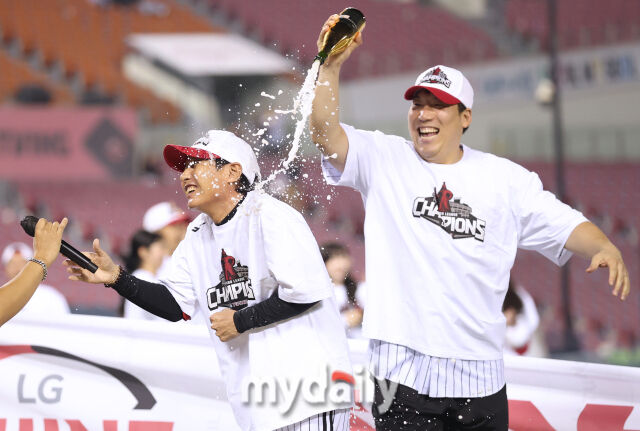 우승을 확정 지은 LG 트윈스 선수들이 기뻐하고 있다. 염경엽 감독에게 샴페인을 붓는 김현수.