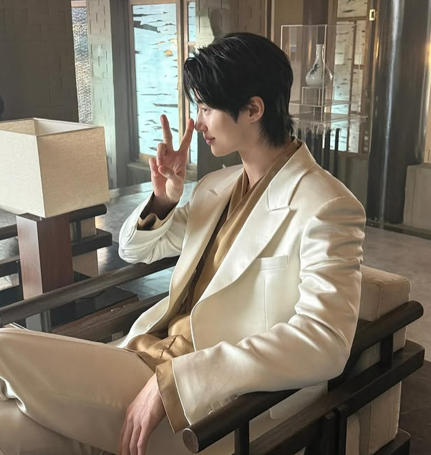 사진 속 변우석은 베이지 톤의 슈트를 입고 의자에 앉아 있다. 어딘가를 바라보며 브이 포즈를 취하고 있어 눈길을 끈다.