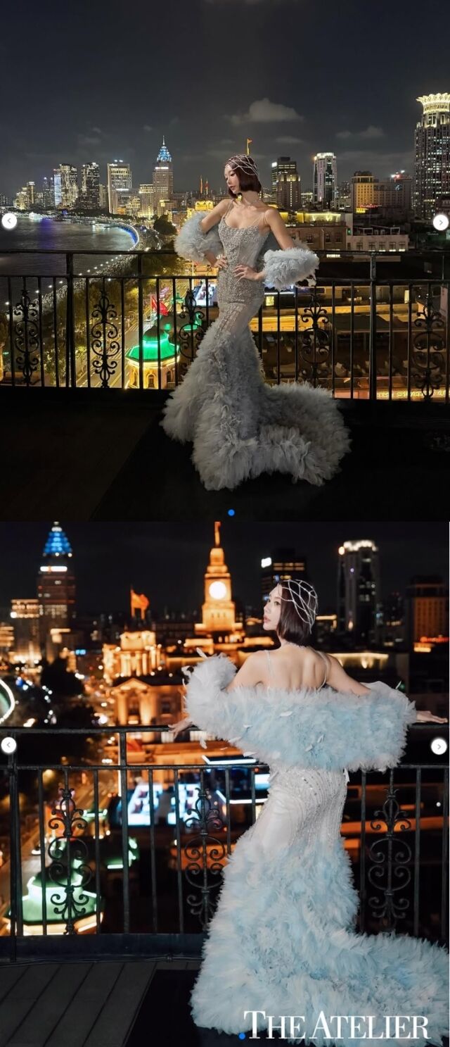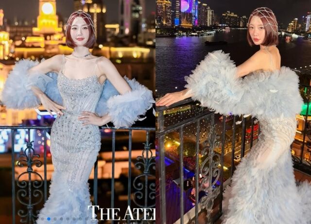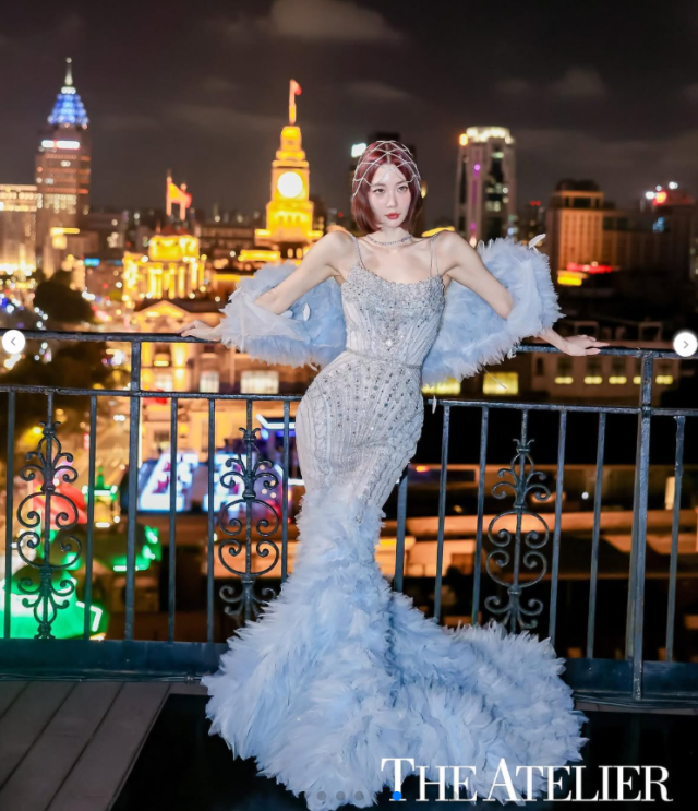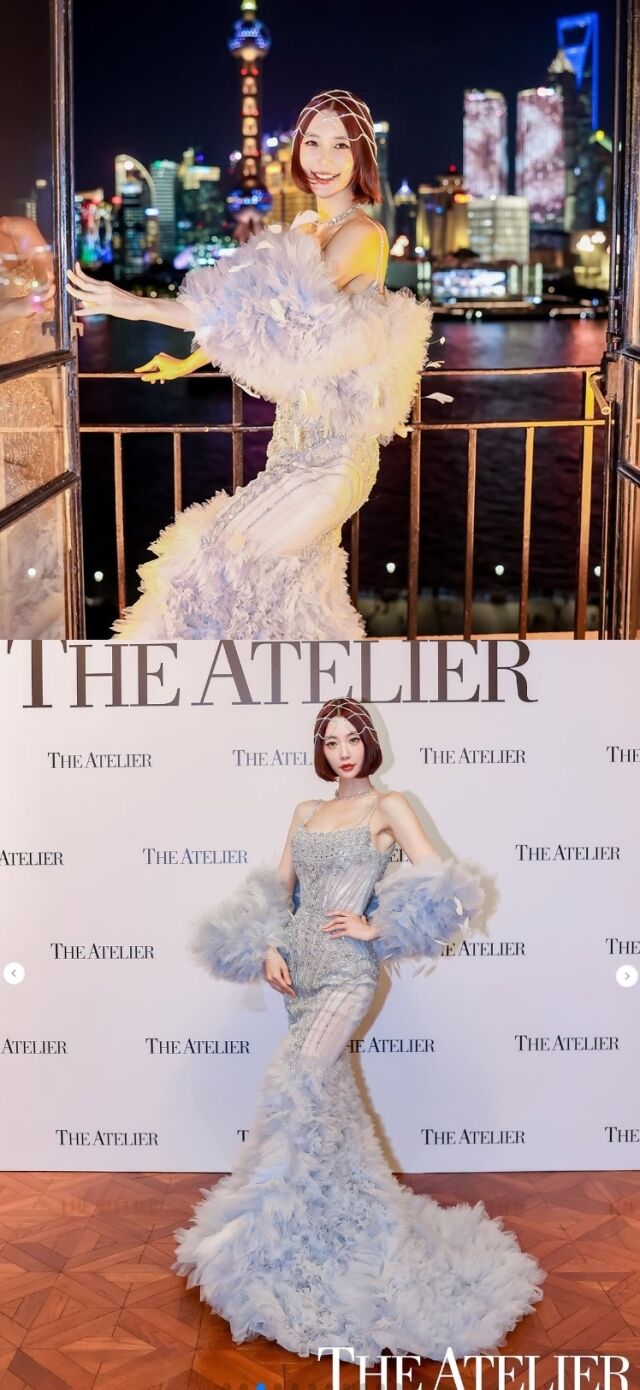 특히, 의상에는 눈부신 비즈 장식과 풍성한 깃털 트레인, 그리고 소매 부분의 퍼(fur) 장식이 더해져 고급스러우면서도 극적인 무드를 빚어냈다. 여기에 짧은 웨이브 보브 헤어와 헤드 체인 액세서리를 매치하여 신화 속 여신 같은 분위기를 연출했다. 상하이의 찬란한 야경을 배경으로, 그녀는 영화의 한 장면과 같은 빼어난 비주얼을 뽐냈다.