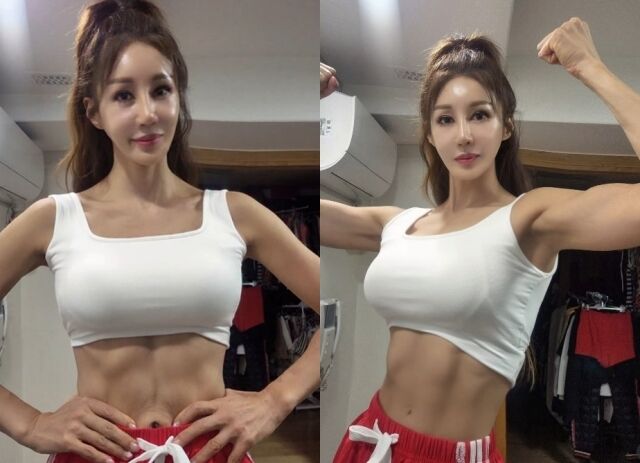 김혜연은 민소매 크롭탑을 입고 허리에 손을 올리거나 팔근육을 보여주는 등 다양한 포즈를 취하고 있다. 탄탄한 몸매라인과 선명한 복근, 펌핑된 팔근육이 감탄을 자아낸다. 올해 만 54세라는 나이가 믿기지 않는다.