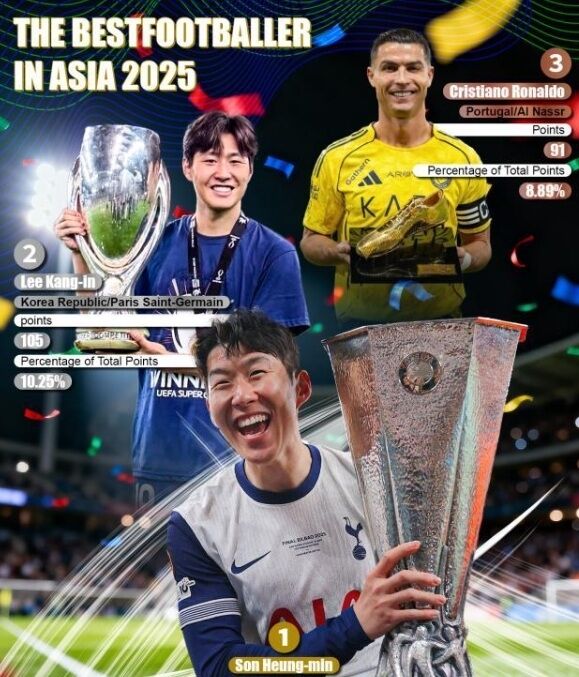 '베스트 풋볼러 인 아시아'는 지난 2013년 첫 시상식을 진행해 일본의 혼다가 첫 수상자로 선정됐다. 이후 손흥민이 2014년 수상자로 선정됐고 손흥민은 올해 수상과 함께 통산 10번째 상을 수상했다. 손흥민은 지난해 '베스트 풋볼러 인 아시아' 선정 투표에서 2위를 차지한 이후 2년 만의 수상에 성공했다. 손흥민을 제외하면 아피프(카타르), 혼다(일본), 오카자키 신지(일본) 등 3명만 이 상을 수상했다. 호날두는 지난 2023년 시상식 투표에서 3위를 기록한 이후 올해에도 3위를 기록했다. 사우디아라비아 프로리그에서 활약하고 있는 마레즈와 벤제마는 각각 4위와 5위를 기록했다.
