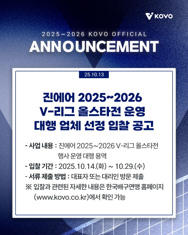 한국배구연맹(KOVO)은 14일 보도자료를 통해 "2026년 1월 24일(토)부터 25일(일)까지 강원도 춘천시 호반체육관에서 개최 예정인 진에어 2025~2026 V-리그 올스타전의 운영 대행업체를 모집한다"고 밝혔다.