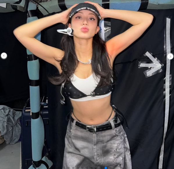 사진 속 지효는 실험적이고 힙한 스타일링을 선보였다. 복근이 드러나는 크롭탑 위에 블랙 비키니 스타일의 브라렛을 레이어드하여 과감함을 더했다. 하의는 로우라이즈로 착용한 듯한 워싱된 그레이 진에 얇은 스트랩 디테일을 추가해 트렌디한 Y2K 무드를 강조했다. 액세서리로는 볼캡과 체인 목걸이를 매치하여 스포티하면서도 카리스마 넘치는 무대 의상을 완성했다.