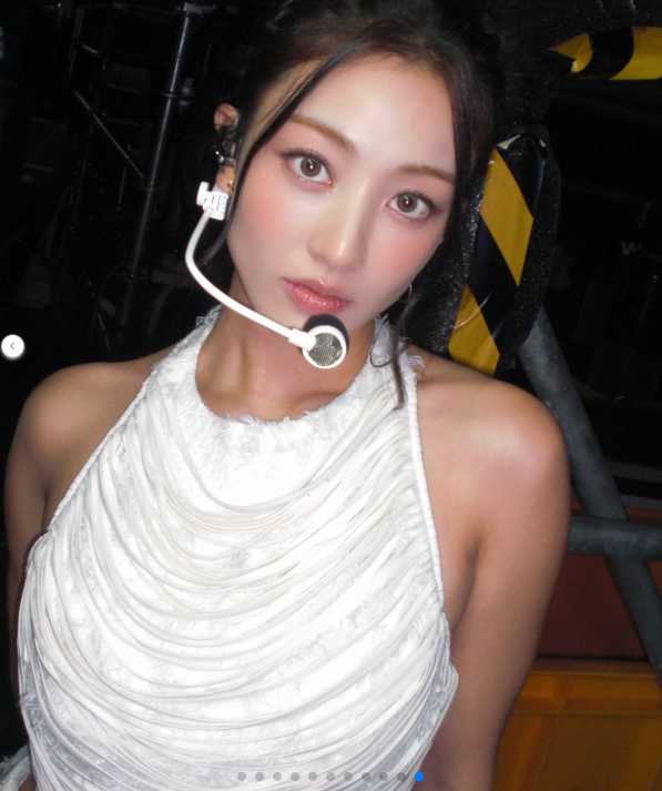 또 다른 사진에서는 화이트 드레이프 디테일의 홀터넥 의상을 입고 카리스마 있는 눈빛을 뽐냈다. 정돈된 헤어와 이어마이크, 절제된 메이크업이 어우러져 무대 위 아티스트다운 카리스마를 풍겼다.