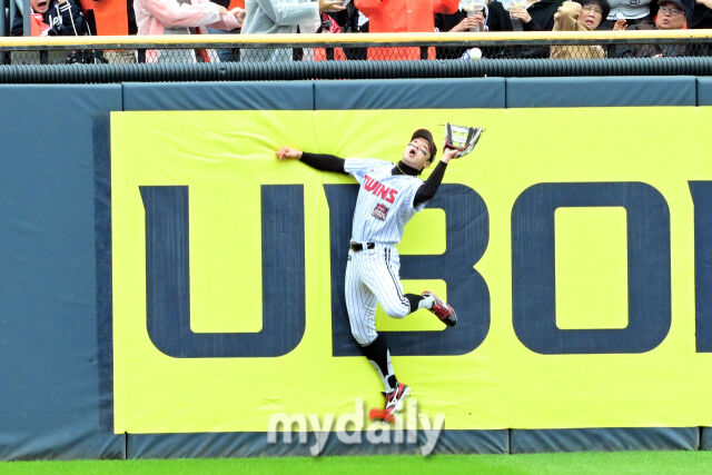 박해민은 1회초 1사 1루에서 한화 문현빈의 장타를 훔쳤다. 톨허스트의 커트를 공략한 문현빈의 타구를 담장 앞까지 가는 큰 타구였다.