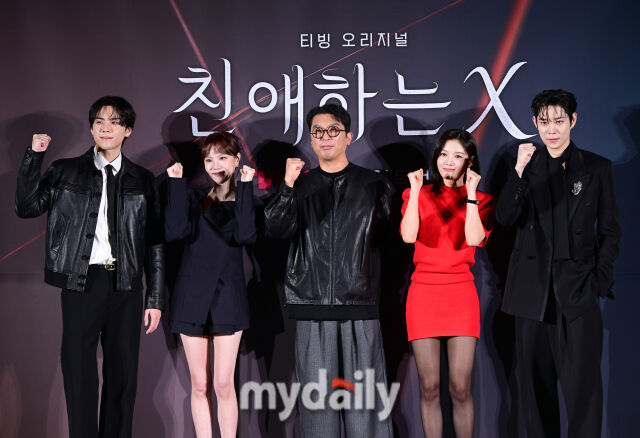 [마이데일리 = 유진형 기자] 30일 오후 서울 용산구 CGV 용산아이파크몰에서 열린 티빙 오리지널 시리즈 ‘친애하는 X’ 제작발표회가 열렸다. 배우 김도훈, 이열음, 이응복 감독, 김유정, 김영대(왼쪽부터)가 인사하고 있다.