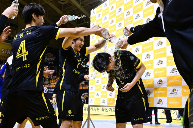 [팀 승리를 이끈 황택의가 물세례를 받고 있다 / 한국배구연맹(KOVO)]