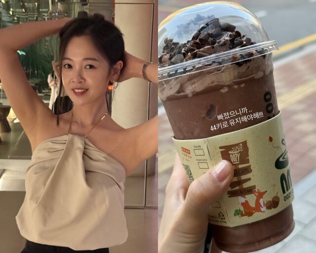 그러나 정작 김보미는 "빠졌으니까 44kg 유지해야 해"라며 음료 한 잔을 인증했다. 초코칩과 초코 휘핑이 듬뿍 올라간 초코음료가 그 주인공이다. 보기만 해도 달콤한 고칼로리 음료인 만큼 살을 찌우려는 노력으로 보인다.
