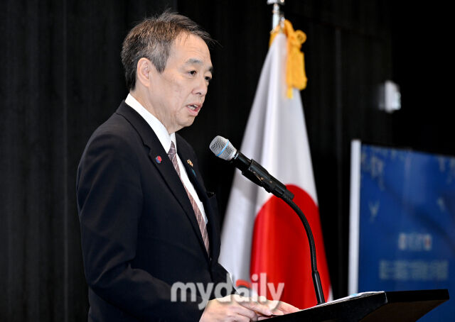 미즈시마 고이치 주한일본대사가 22일 오전 제주시 노형동 제주드림타워 복합리조트에서 진행된 개회식에서 다카이치 사나에 일본 총리의 축사를 대독하고 있다.