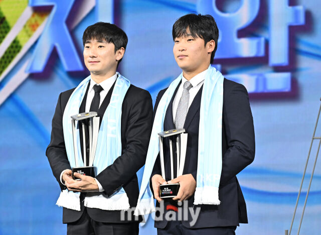 [마이데일리 = 송일섭 기자] LG 신민재와 오지환(박관우 대리수상)이 1일 오전 서울 광장동 비스타 워커힐 서울에서 진행된 '2025 리얼글러브 어워드(REAL GLOVE AWARD)'에서 베스트 키스톤콤비상을 수상하고 있다.