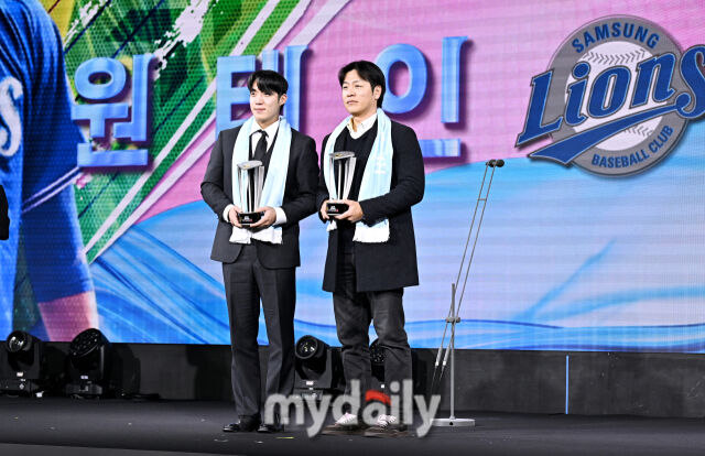 [마이데일리 = 송일섭 기자] 삼성 원태인과 강민호가 1일 오전 서울 광장동 비스타 워커힐 서울에서 진행된 '2025 리얼글러브 어워드(REAL GLOVE AWARD)'에서 베스트 배터리상을 수상하고 있다.